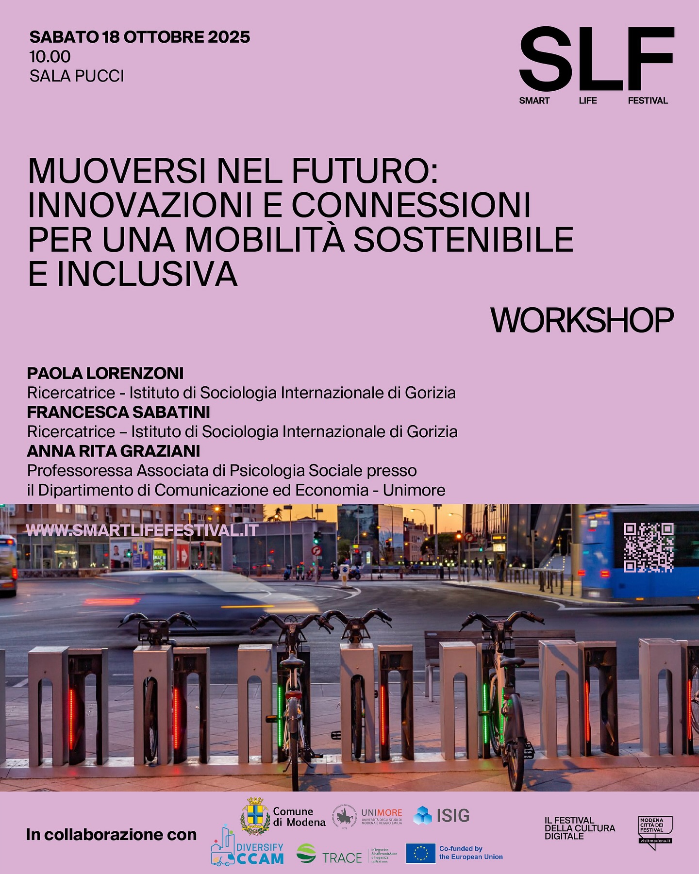 L’evento è organizzato da Comune di Modena, Istituto di Sociologia Internazionale di Gorizia e Università di Modena e Reggio Emilia nell’ambito dei progetti europei Diversify-CCAM e TRACE, finanziati dal programma Horizon Europe. Fa parte del programma di Smart Life Festival (Modena, 17-19 ottobre 2025)
